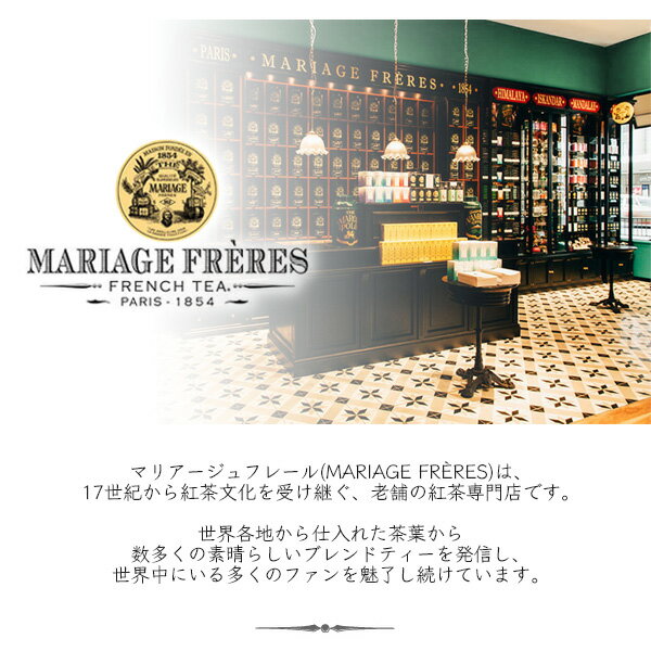 MARIAGE FRERES(マリアージュ・フレール) MARCO POLO(マルコポーロ) マリアージュフレール(MARIAGE FRERES)は、 17世紀から紅茶文化を受け継ぐ、老舗の紅茶専門店です。